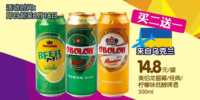 2014巴西世界杯即將打響,歲寶百貨啤酒狂歡節(jié)隆重登場,讓你嗨購味!即日起至6月18日,烏克蘭奧伯龍窖藏/經(jīng)典/檸檬味低醇啤酒500ml14.8元/罐,買二送一!