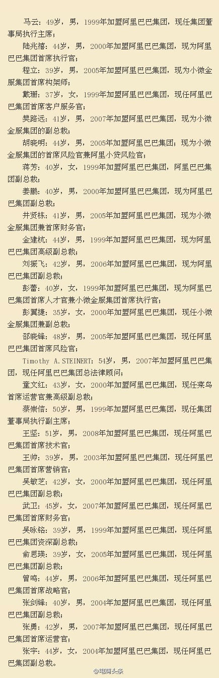 馬云擔(dān)任執(zhí)行主席;蔡崇信擔(dān)任執(zhí)行副主席;陸兆禧擔(dān)任首席執(zhí)行官;張勇?lián)问紫\(yùn)營(yíng)官;武衛(wèi)擔(dān)任首席財(cái)務(wù)官; 王堅(jiān)擔(dān)任首席技術(shù)官;姜鵬擔(dān)任阿里巴巴云計(jì)算總裁兼副首席技術(shù)官;邵曉鋒擔(dān)任首席風(fēng)險(xiǎn)官;戴珊擔(dān)任首席客戶官; Timothy A.STEINERT擔(dān)任法律總顧問(wèn)和企業(yè)秘書。