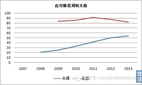2. 庫存。庫存天數(shù)相對合理,實體店有模型,每個店不同,可以自動補貨。庫存管理重要的是執(zhí)行力,發(fā)覺規(guī)律后要堅持退貨,降低庫存。13年的數(shù)據(jù)庫存周轉(zhuǎn)天數(shù)50-60天,主要原因一是百貨類的比較多,商品比重食品類占58%(其中生鮮占比22%),非食用類(包括清潔美妝類)的占42%。所以庫存周轉(zhuǎn)天數(shù)會比生鮮比重較大的永輝超市長一點(永輝生鮮占比45%);二是年底存貨會高一點,平時大約30多天。