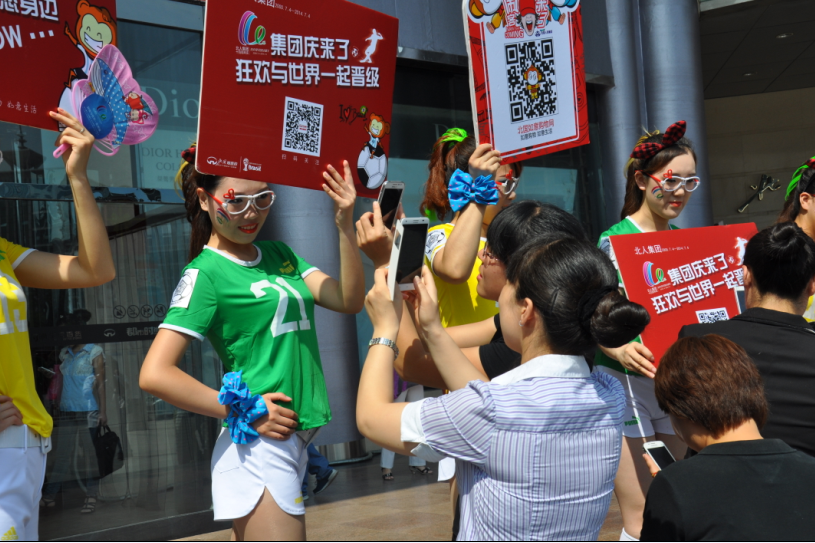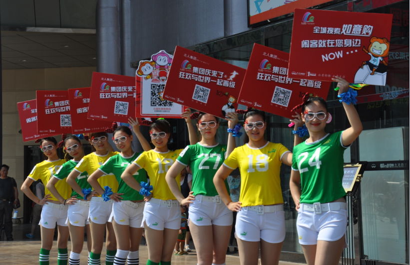 來(lái)自北國(guó)商城的8位禮儀模特,身著世界杯球隊(duì)球衣,手臂及后背分別貼附北國(guó)如意購(gòu)及本店的微信二維碼,與全城市民一起互動(dòng)。她們用青春靚麗的風(fēng)采為世界杯搖旗吶喊,為北人集團(tuán)14周年慶振臂助威,為北國(guó)如意購(gòu)網(wǎng)啟動(dòng)全城搜索模式!
