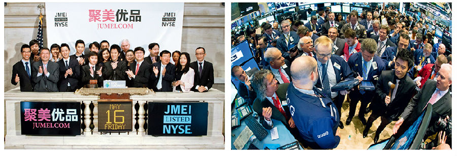 (左) 聚美高管和董事會團隊在敲鐘儀式上。天使投資人徐小平投的38萬美元4年間翻了800多倍