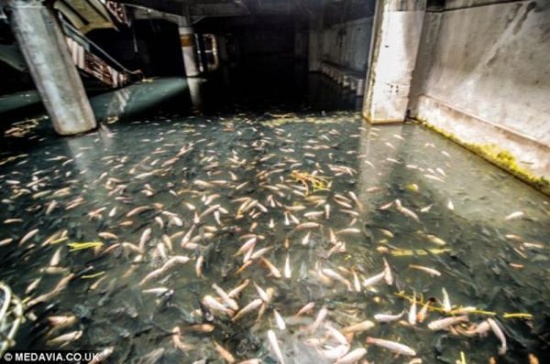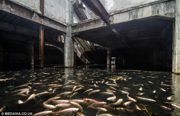 為消滅害蟲(chóng),當(dāng)?shù)厝碎_(kāi)始向積水中投入魚(yú)。10多年過(guò)去了,這些魚(yú)成了一景兒:它們繁殖的大量的后代,“占據(jù)”了廢棄的購(gòu)物中心一樓各處。這個(gè)“魚(yú)樓”非常安靜,但不遠(yuǎn)處就是喧鬧的大街。