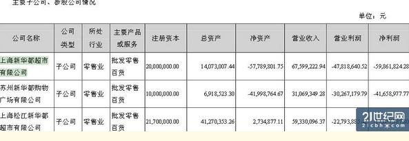 根據(jù)新華都2013年財報,新華都旗下的上海新華都超市有限公司、蘇州新華都購物廣場有限公司、上海松江新華都超市有限公司,分別虧損5986萬元、4166萬元、1709萬元。