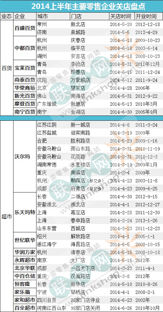 截止2014年6月30日,據(jù)聯(lián)商網(wǎng)《2014年上半年主要零售企業(yè)關(guān)店統(tǒng)計》顯示,2014年上半年,主要零售企業(yè)(不含家居、電器)在國內(nèi)共計關(guān)閉158家門店,遠(yuǎn)超2013全年35家的關(guān)店數(shù)。