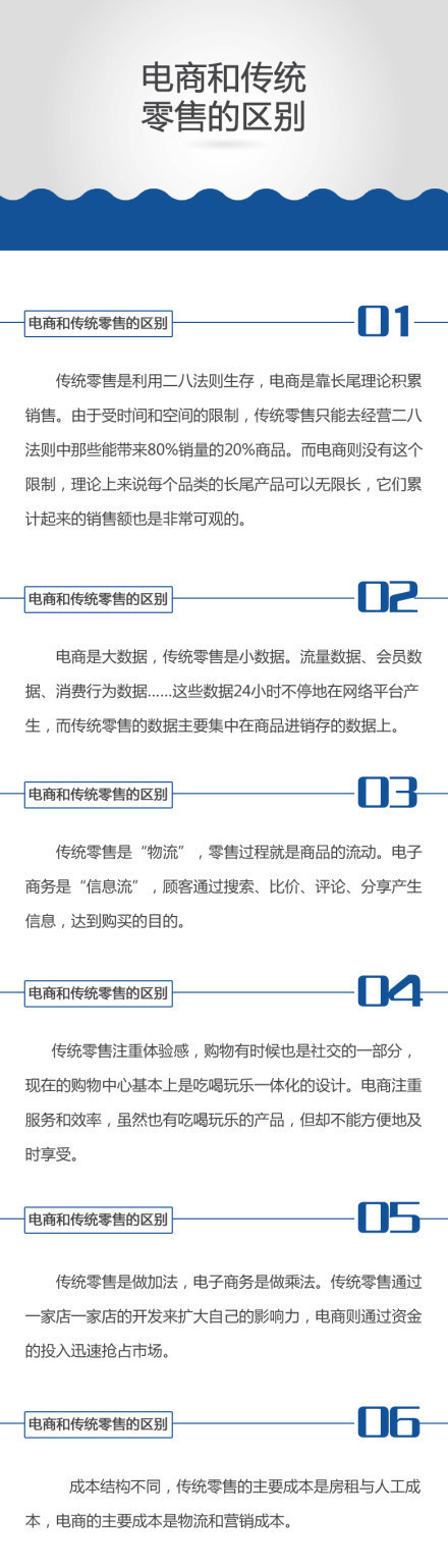 ➊傳統(tǒng)零售利用二八法則生存,電商靠長(zhǎng)尾理論積累銷售;➋電商是大數(shù)據(jù),傳統(tǒng)零售是小數(shù)據(jù);➌傳統(tǒng)零售是“物流”,電子商務(wù)是“信息流“;➍傳統(tǒng)零售注重體驗(yàn)感,電商注重服務(wù)和效率...詳情見圖↓↓↓