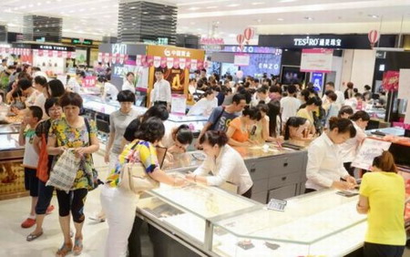 隨意在幾個柜臺轉(zhuǎn)了轉(zhuǎn)。中國黃金、金藝華、伊蓮等好幾個柜臺給出的金價都是268元/克,相比前日325元/克便宜了57元。相比這些以赤裸裸價格吸引消費(fèi)者的柜臺,周大福、周生生的廳房更是被圍得水泄不通。一向“高大上”的周生生此次也打出了鑲嵌類八折、購克拉鉆戒再享9.5折,定價鉑金9折的宣傳。“一款2克拉的鉆戒連送帶折9萬塊左右,的確實惠。”一位顧客說。
