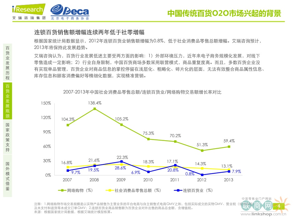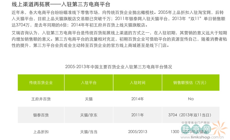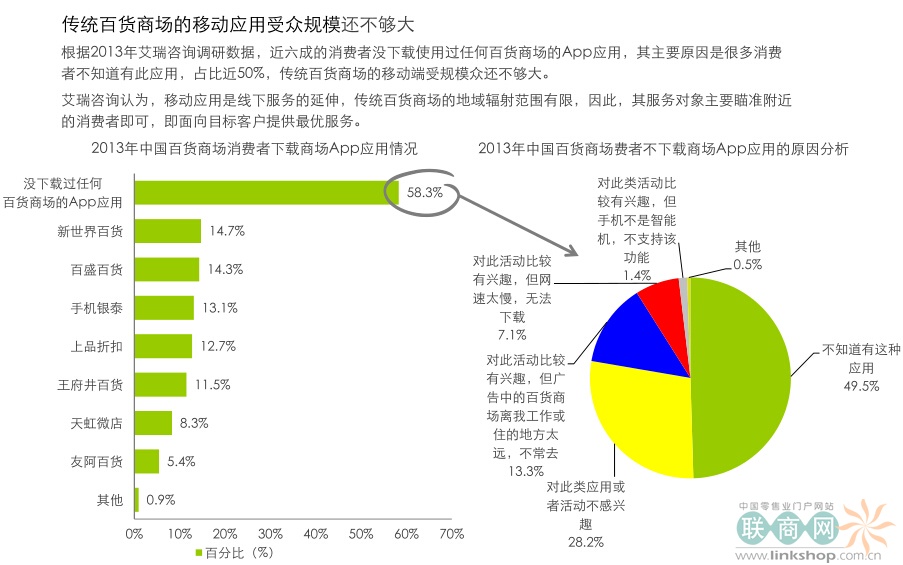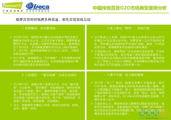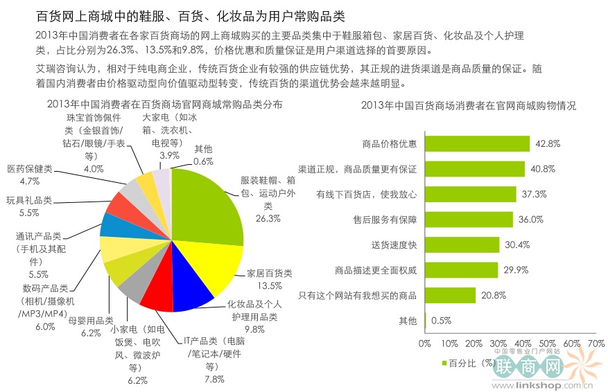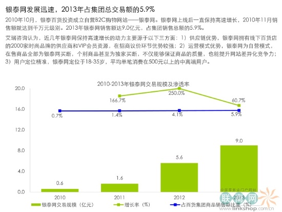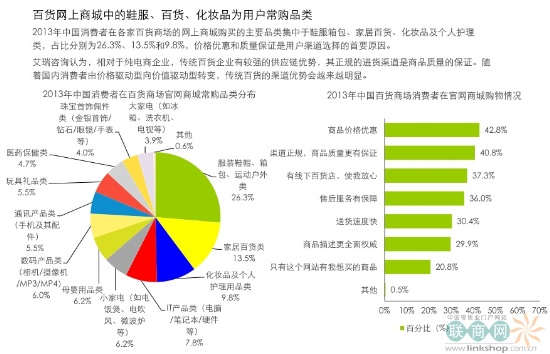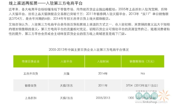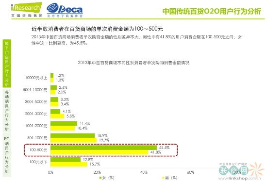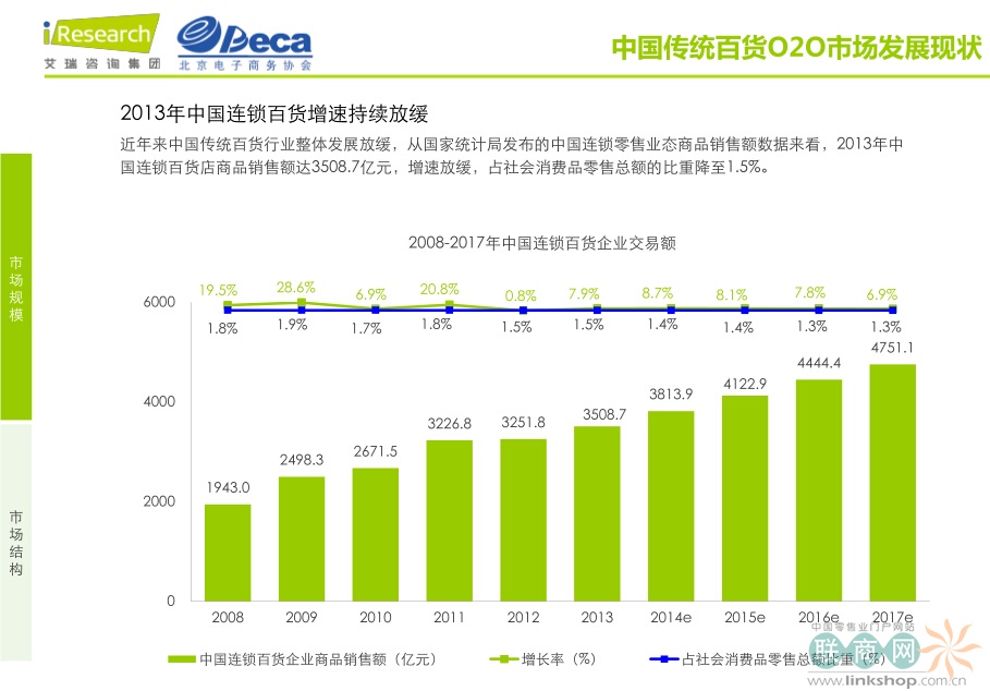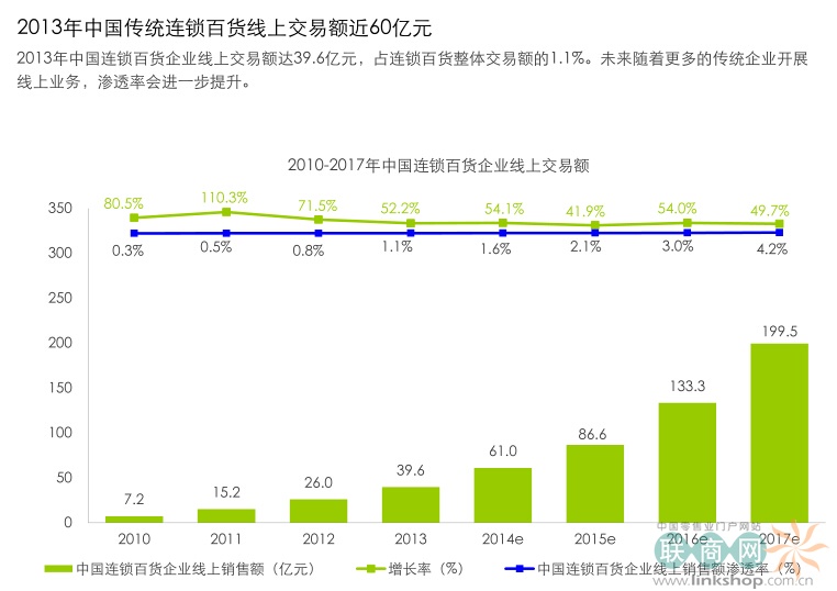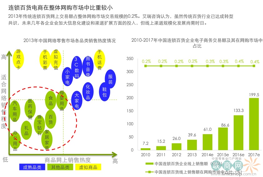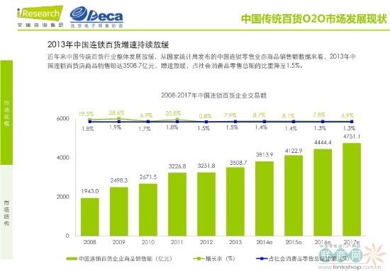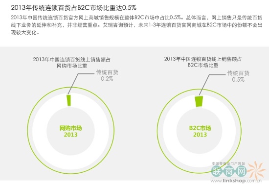 聯(lián)商網(wǎng)消息:7月23日,據(jù)艾瑞網(wǎng)發(fā)布的《2014年中國(guó)傳統(tǒng)百貨O2O市場(chǎng)及用戶(hù)研究報(bào)告》顯示,2013年中國(guó)連鎖百貨店商品銷(xiāo)售額達(dá)3508.7億元,增速放緩,占社會(huì)消費(fèi)品零售總額的比重降至1.5%。2013年中國(guó)連鎖百貨企業(yè)線(xiàn)上交易額達(dá)39.6億元,占連鎖百貨整體交易額的1.1%。2013年傳統(tǒng)連鎖百貨網(wǎng)上交易額占整體網(wǎng)購(gòu)市場(chǎng)交易規(guī)模的0.2%,傳統(tǒng)連鎖百貨官方網(wǎng)上商城銷(xiāo)售規(guī)模在整體B2C市場(chǎng)占比0.5%。