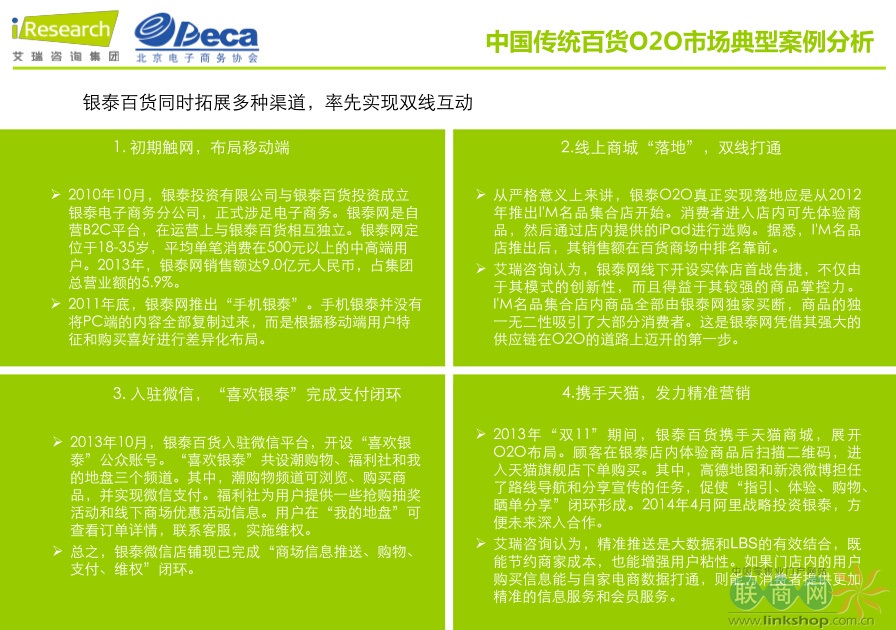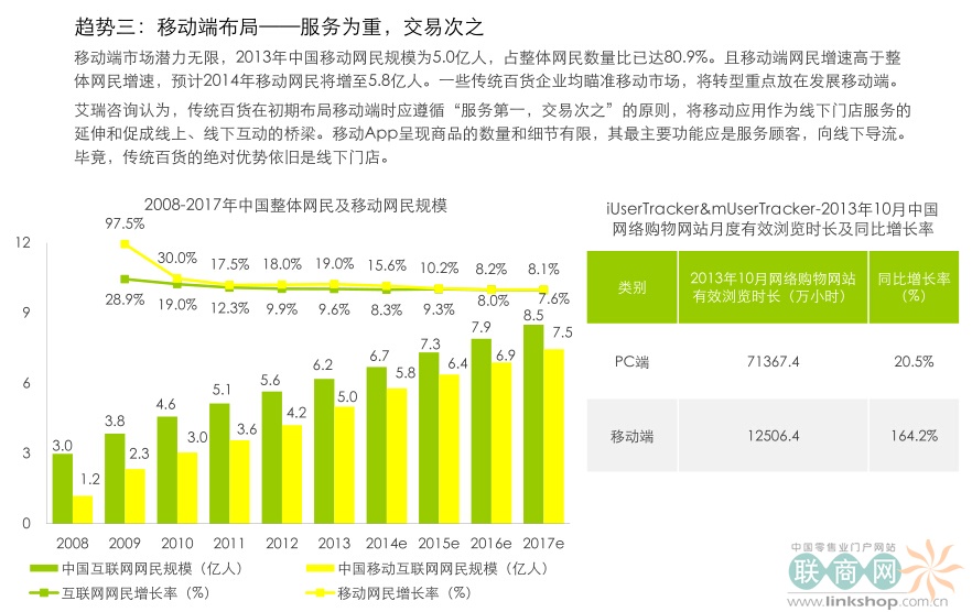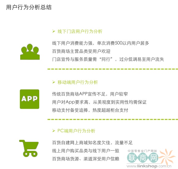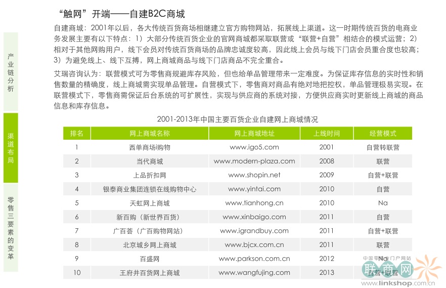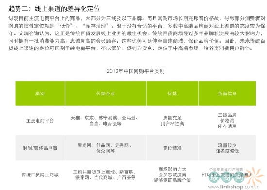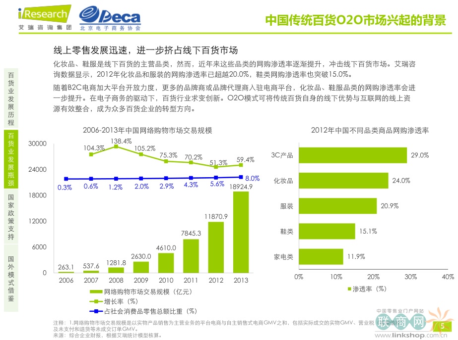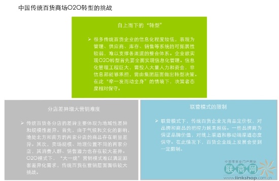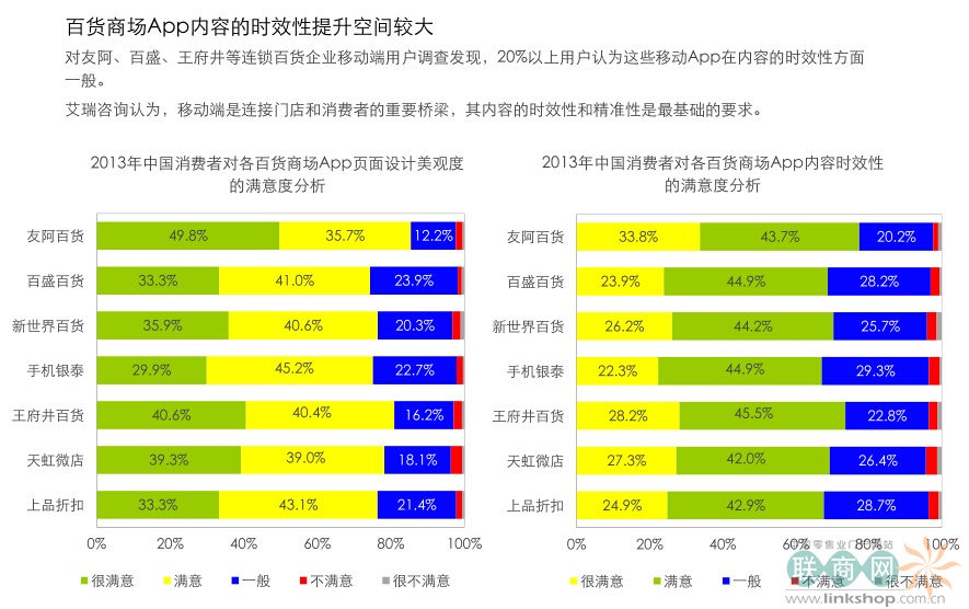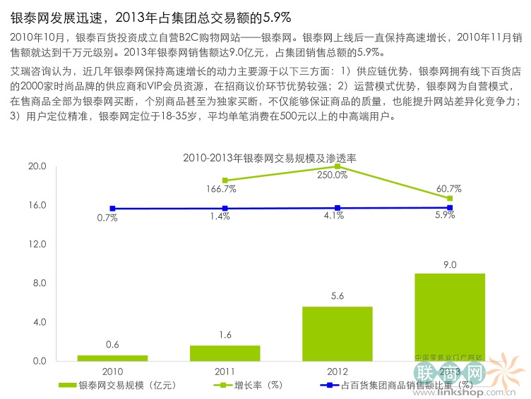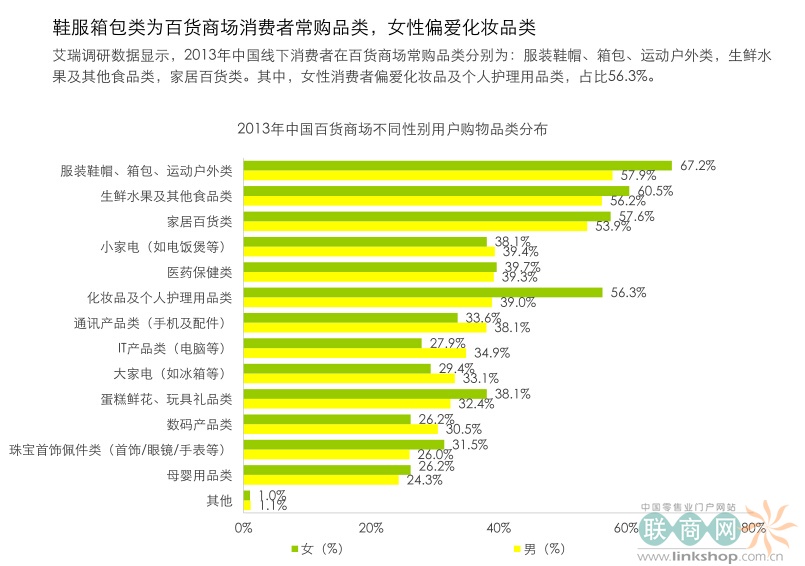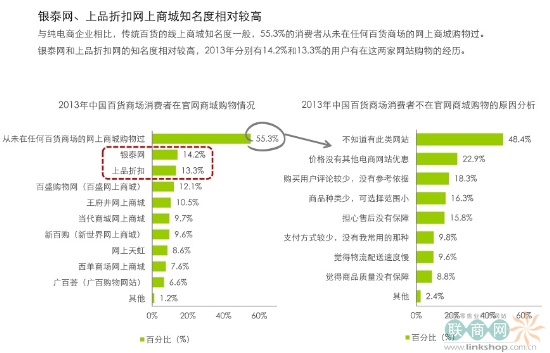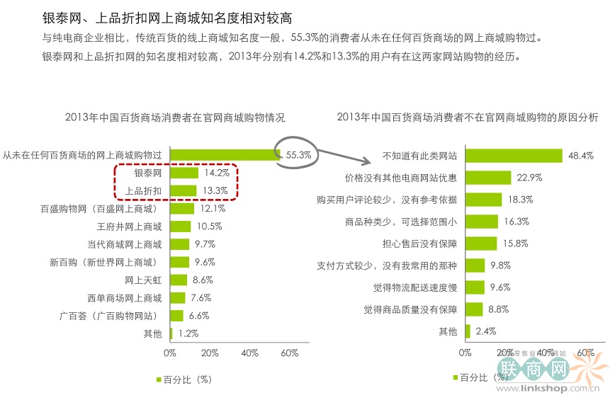 聯(lián)商網(wǎng)消息:7月23日,據(jù)艾瑞網(wǎng)發(fā)布的《2014年中國(guó)傳統(tǒng)百貨O2O市場(chǎng)及用戶(hù)研究報(bào)告》顯示,2013年中國(guó)連鎖百貨店商品銷(xiāo)售額達(dá)3508.7億元,增速放緩,占社會(huì)消費(fèi)品零售總額的比重降至1.5%。2013年中國(guó)連鎖百貨企業(yè)線(xiàn)上交易額達(dá)39.6億元,占連鎖百貨整體交易額的1.1%。2013年傳統(tǒng)連鎖百貨網(wǎng)上交易額占整體網(wǎng)購(gòu)市場(chǎng)交易規(guī)模的0.2%,傳統(tǒng)連鎖百貨官方網(wǎng)上商城銷(xiāo)售規(guī)模在整體B2C市場(chǎng)占比0.5%。