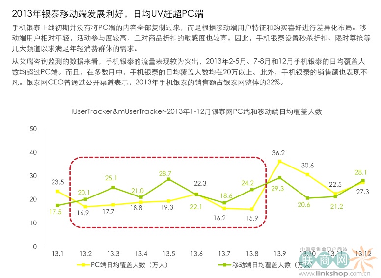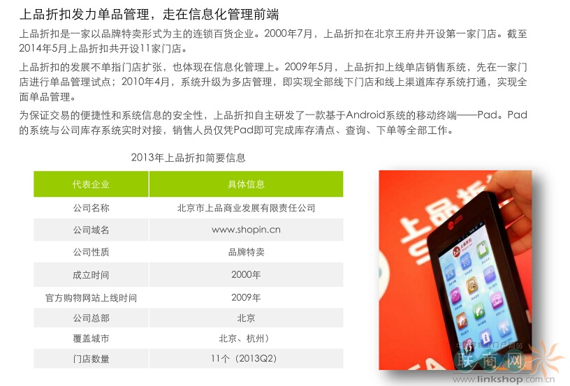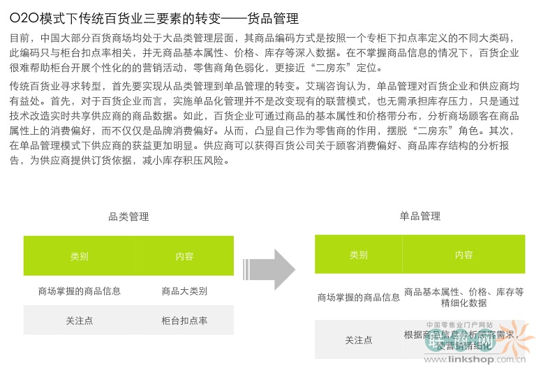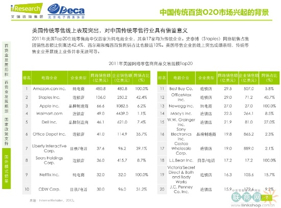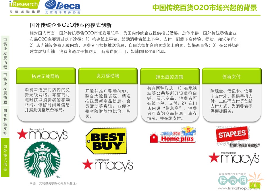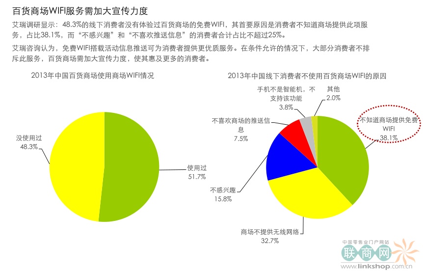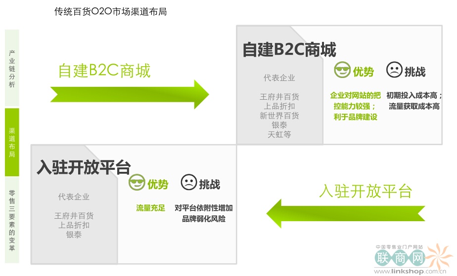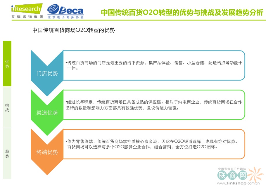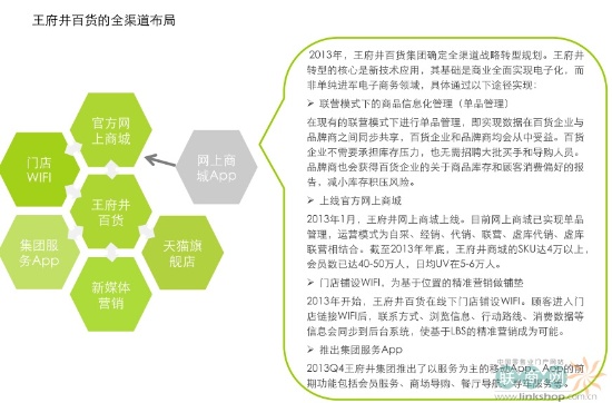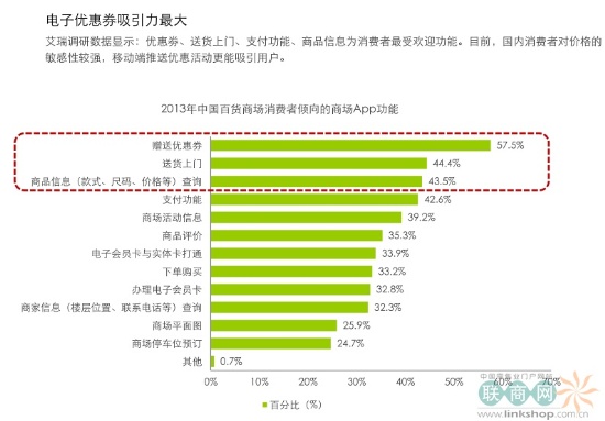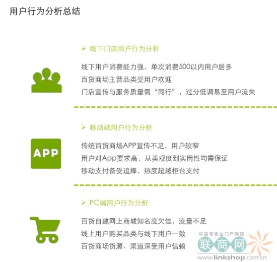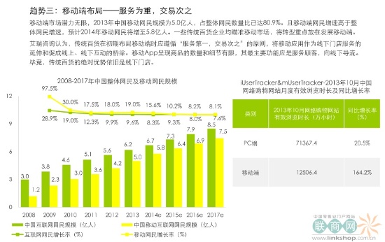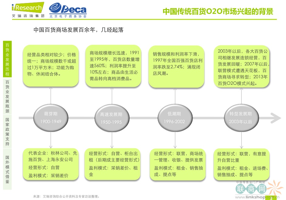 聯(lián)商網(wǎng)消息:7月23日,據(jù)艾瑞網(wǎng)發(fā)布的《2014年中國(guó)傳統(tǒng)百貨O2O市場(chǎng)及用戶(hù)研究報(bào)告》顯示,2013年中國(guó)連鎖百貨店商品銷(xiāo)售額達(dá)3508.7億元,增速放緩,占社會(huì)消費(fèi)品零售總額的比重降至1.5%。2013年中國(guó)連鎖百貨企業(yè)線(xiàn)上交易額達(dá)39.6億元,占連鎖百貨整體交易額的1.1%。2013年傳統(tǒng)連鎖百貨網(wǎng)上交易額占整體網(wǎng)購(gòu)市場(chǎng)交易規(guī)模的0.2%,傳統(tǒng)連鎖百貨官方網(wǎng)上商城銷(xiāo)售規(guī)模在整體B2C市場(chǎng)占比0.5%。