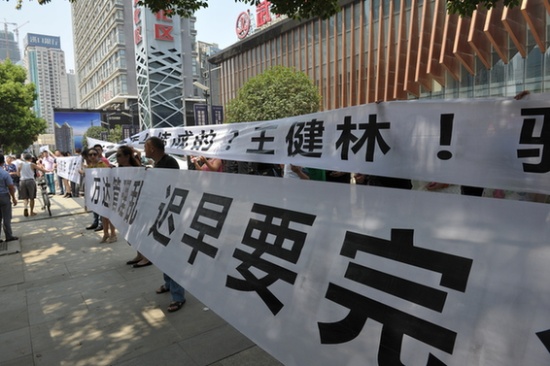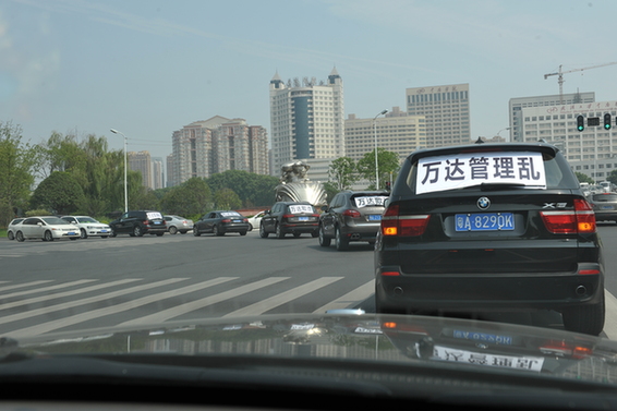 路虎、保時(shí)捷、寶馬、奔馳……一排豪車后窗玻璃上貼著如上標(biāo)語,緩緩駛?cè)胛錆h萬達(dá)漢街銷售部(又稱“武漢中央商務(wù)區(qū)”),自稱是武漢萬達(dá)公館的業(yè)主在現(xiàn)場(chǎng)還拉起了“萬達(dá)管理亂,遲早要完蛋”的白底黑字橫幅。