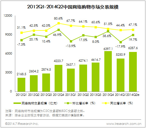艾瑞咨詢最新數(shù)據(jù)顯示,2014Q2中國(guó)網(wǎng)絡(luò)購(gòu)物市場(chǎng)交易規(guī)模達(dá)6287.6億元,同比增長(zhǎng)47.1%;根據(jù)國(guó)家統(tǒng)計(jì)局發(fā)布的數(shù)據(jù)顯示,2014Q2我國(guó)社會(huì)消費(fèi)品零售總額達(dá)到6.2萬(wàn)億元,網(wǎng)絡(luò)購(gòu)物在社會(huì)消費(fèi)品零售總額中的占比為10.1%,首次單季度滲透率突破10%。
