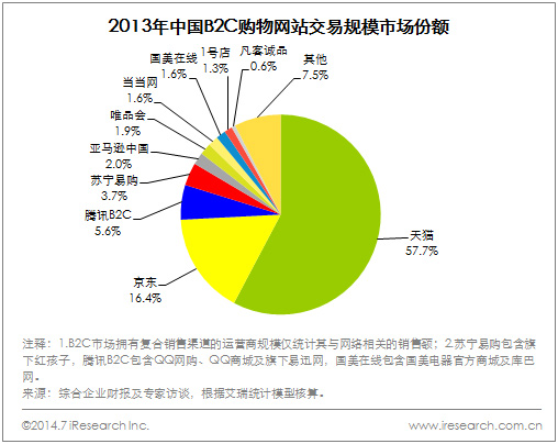 根據(jù)艾瑞咨詢的研究數(shù)據(jù)顯示, 2013年B2C在網(wǎng)絡(luò)購(gòu)物市場(chǎng)中占比達(dá)到40.4%,B2C市場(chǎng)增長(zhǎng)迅速,預(yù)計(jì)2014年在網(wǎng)絡(luò)購(gòu)物市場(chǎng)中占比將近半。其中,天貓2013年實(shí)現(xiàn)交易額4410億元,京東2013年實(shí)現(xiàn)交易額1255億元,兩家企業(yè)年增長(zhǎng)率均在70%以上,整體為B2C市場(chǎng)交易規(guī)模份額提升起到重要作用。