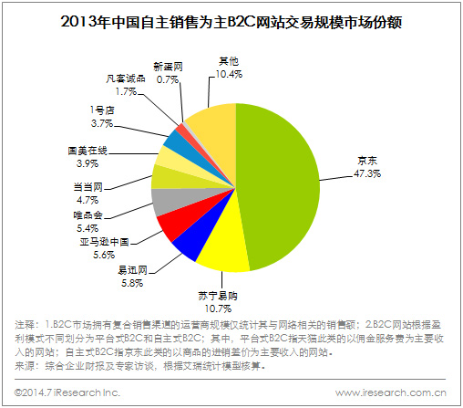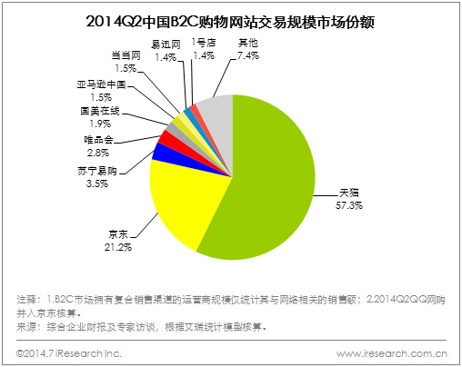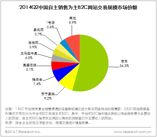從2014Q2來看,B2C市場(chǎng)中,天貓依然保持近六成的市場(chǎng)份額占比,京東占比達(dá)到21.2%,其余B2C企業(yè)中唯品會(huì)、國(guó)美在線、1號(hào)店的同比增速均高于B2C行業(yè)整體增速。從自主銷售為主B2C市場(chǎng)來看,京東占比超過五成,蘇寧易購(gòu)占比近10%,此外唯品會(huì)及國(guó)美在線占比均超過5%,市場(chǎng)集中度依然較高。