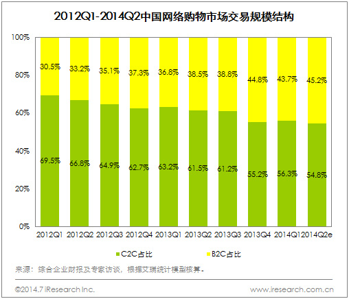 市場(chǎng)結(jié)構(gòu):2014Q2B2C占網(wǎng)絡(luò)購(gòu)物市場(chǎng)的45.2%,較2013Q2提高6.7個(gè)百分點(diǎn)