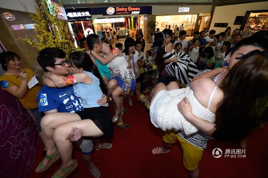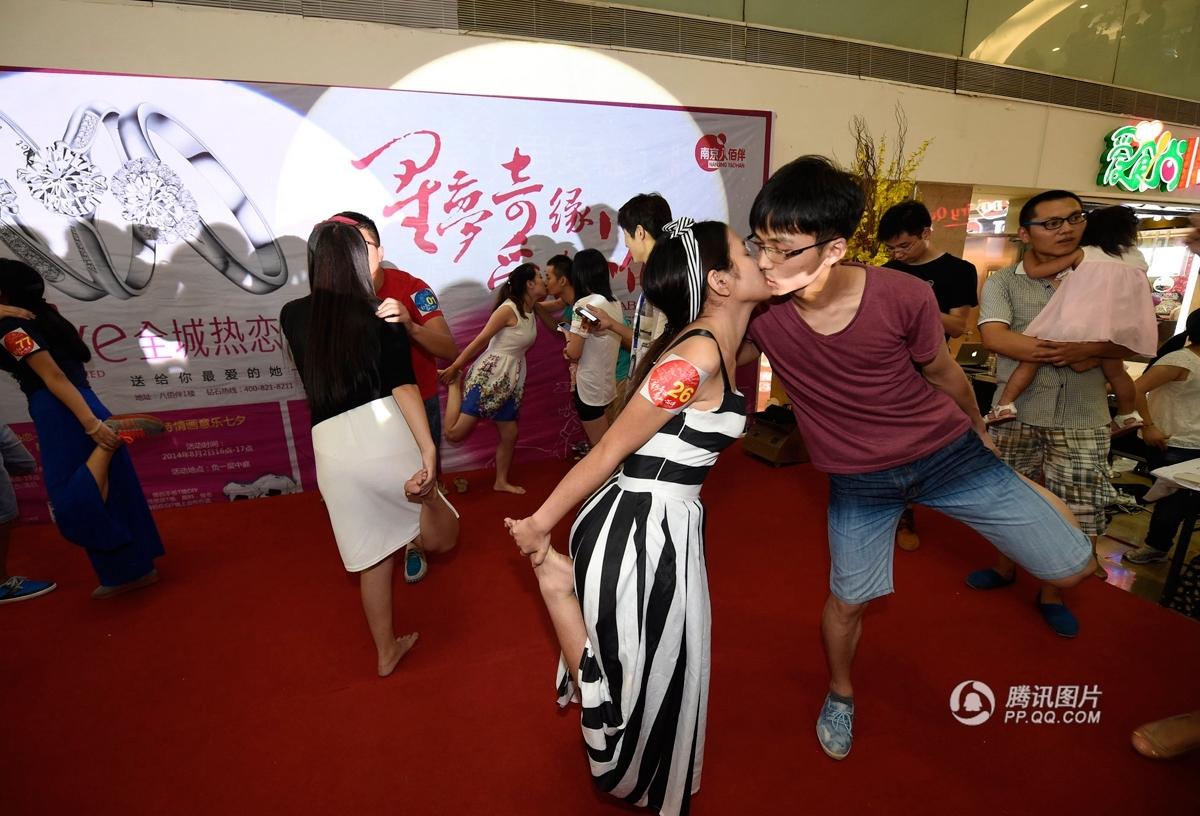 8月2日,江蘇省南京市, 農(nóng)歷7月初7是中國傳統(tǒng)的“情人節(jié)”,當晚,一場接吻大賽在南京八佰伴舉行,選手們通過多輪姿勢“技巧”的比拼爭奪鉆戒大獎,參賽的戀人們苦吻強撐,動作花樣百出,在七夕中國傳統(tǒng)情人節(jié)這一天,用KISS的方式大膽表達對愛人的真摯情義。