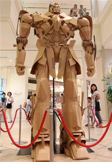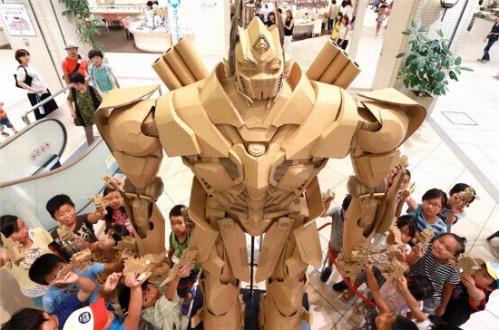 據(jù)制作人千田雅彥介紹,這個(gè)模型是《變形金剛》中的角色之一擎天柱,共使用約60張1.65平米的紙板制成,組裝花費(fèi)了約2個(gè)半月的時(shí)間。到本月19日為止,該模型將在商場(chǎng)的2樓展出。