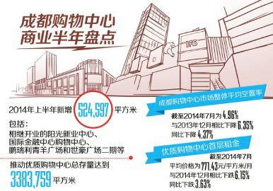 2014年上半年,購物中心市場(chǎng)迎來陽光新業(yè)中心、國(guó)際金融中心、鵬瑞利青羊廣場(chǎng)和世豪廣場(chǎng)二期開業(yè),新增面積524,597平方米,推動(dòng)購物中心存量上升至3383,759平方米,與去年同期相比增長(zhǎng)40.05%。