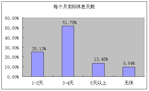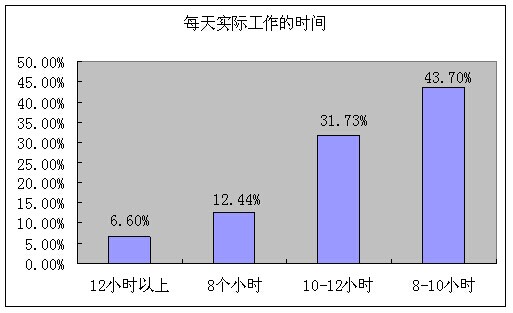 參與的調(diào)查的人中,絕大部分是工作在8個小時以上,其中每天工作8—10小時的46.70%,每天工作12小時以上占到6%以上,但是每天8個小時占到的僅有12.44%。