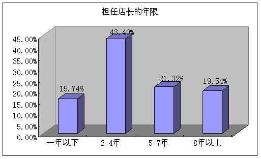 參與本次調(diào)查的門店店長擔(dān)任年限2-4年的最多,占到43.40%;5年以上的占到40.86%,一年即以下的占到15.74%。