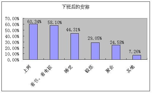 參與調(diào)查的店長中,大部分下班會選擇上網(wǎng)、看書以及看電視,不到30%的人選擇聚會和鍛煉身體。