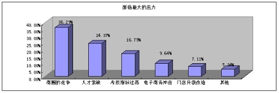 6、店長們覺得商圈競爭和人才缺失是他們最大的壓力,而電子商務(wù)的沖擊對他們的壓力不到10%。