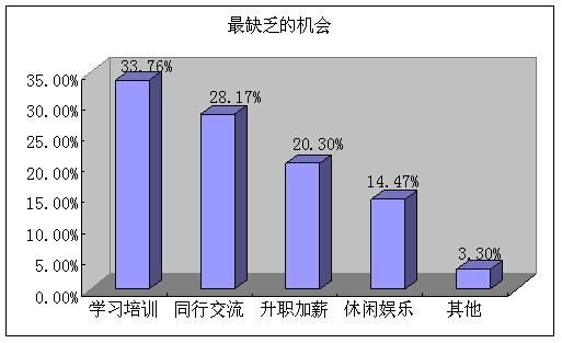 參與調(diào)查的店長中,33%的人覺得最缺乏的就是沒有學(xué)習(xí)培訓(xùn)的機(jī)會;28%的人覺得缺乏跟同行交流的機(jī)會;20%的人覺得缺乏升職加薪的機(jī)會;14%的人覺得缺乏休閑娛樂的機(jī)會。