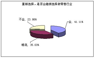參與調(diào)查的店長中,只有40%多點人選繼續(xù)選擇零售行業(yè),35%的人難說會不會選擇零售,近24%的人不會選擇從事零售行業(yè)。