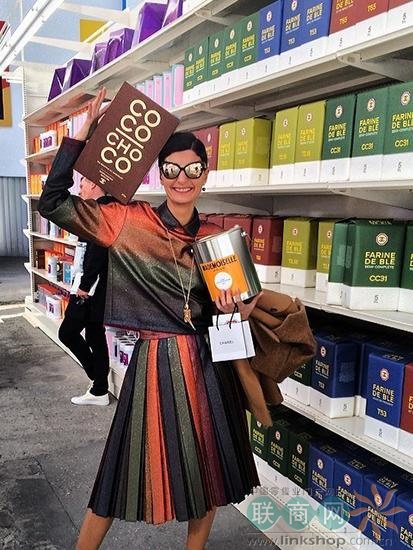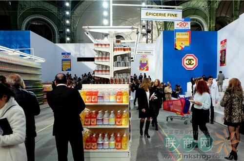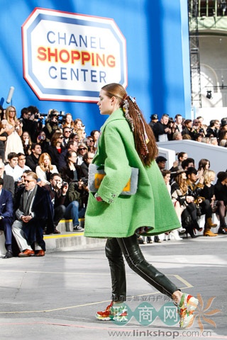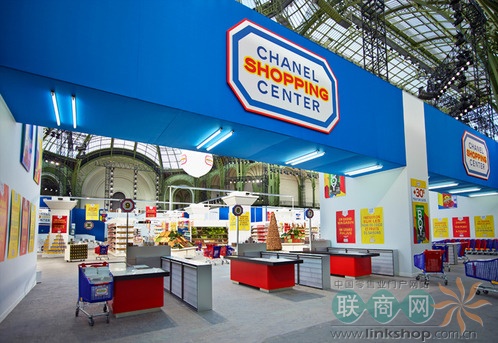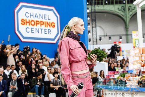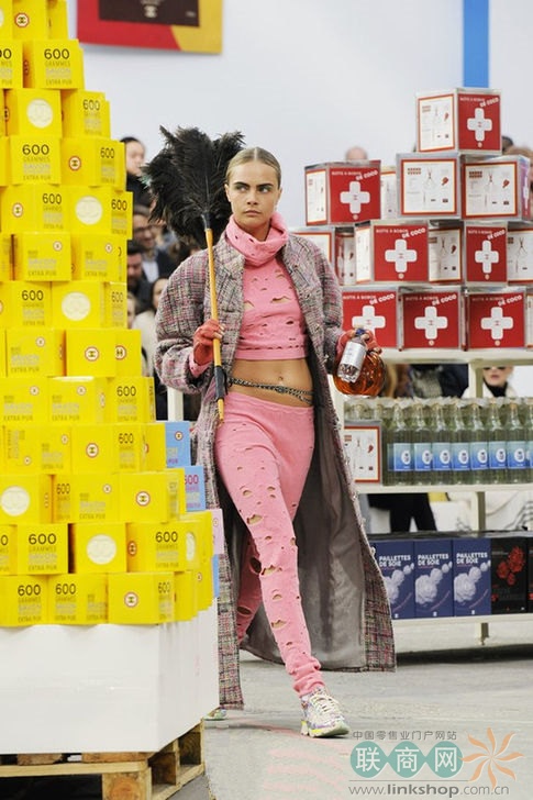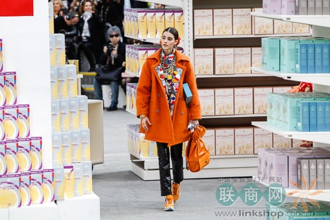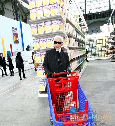 CHANEL設(shè)計(jì)師Karl Lagerfeld把巴黎大皇宮裝修成了大型超市的模樣,讓模特們?cè)诒炯镜陌屠钑r(shí)裝周上一邊購(gòu)物一邊走秀