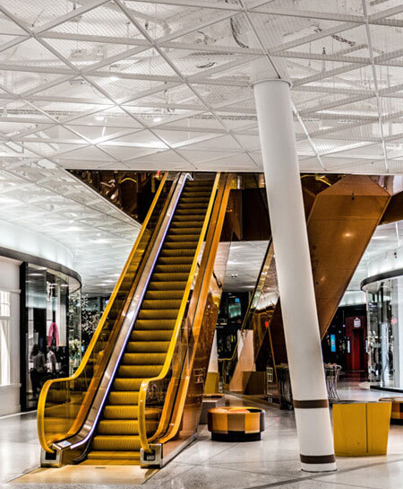 Emporia商業(yè)中心只能向上和向西擴(kuò)建。朝向林蔭大道的獨(dú)立住宅建筑還沒建成,將建在南邊沿街基座上部的其他建筑也還沒有動(dòng)工。Emporia商業(yè)中心的內(nèi)部設(shè)計(jì)顛覆了傳統(tǒng)的模式。亮麗的色彩和被彎曲的視線不同于以往的模式,該項(xiàng)目的規(guī)模和企圖都前所未有,因此所有的設(shè)計(jì)從天花板、地面、店面、標(biāo)牌、家具、玻璃門把手等等都是量身定制的。