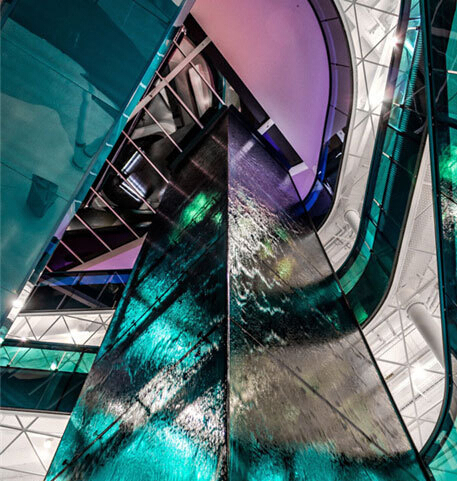 設(shè)計(jì)師的座右銘是“絕不做中間的尺度”,因?yàn)檫@是一個(gè)展示的作品。大尺度的圖案和精制的細(xì)節(jié)讓內(nèi)部空間耐人尋味。夾層平臺(tái)就是一個(gè)典型的設(shè)計(jì)手法,并運(yùn)用了超大號(hào)的三角拼貼圖案。7級(jí)樓梯踏步包括炫目的有色鏡面玻璃的顏色從白色逐漸過渡到石墨色。從皮質(zhì)欄桿扶手到座位的顏色拼接,處處設(shè)計(jì)都體現(xiàn)著對(duì)細(xì)節(jié)的關(guān)注。
