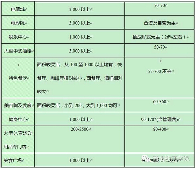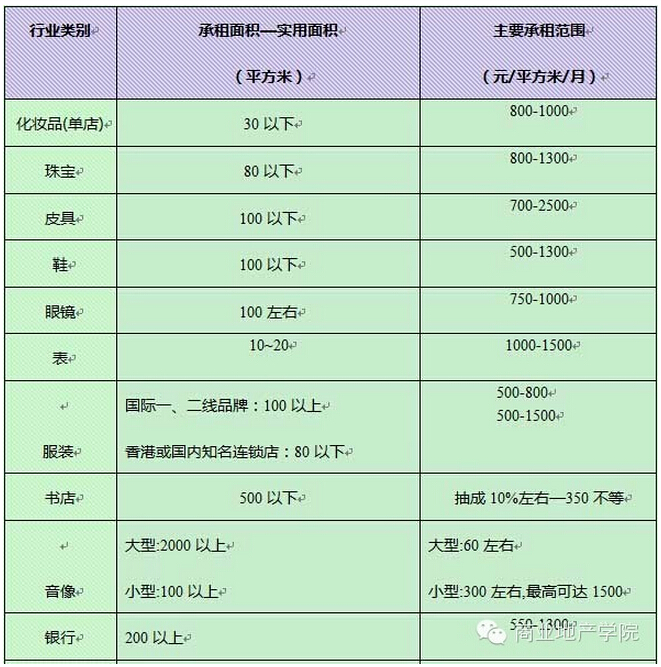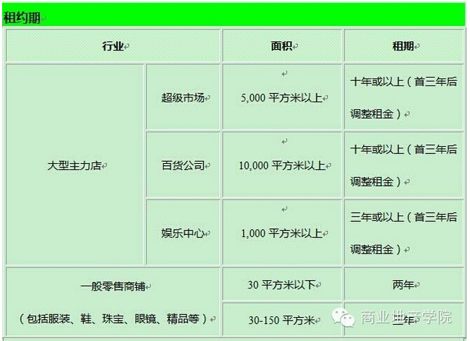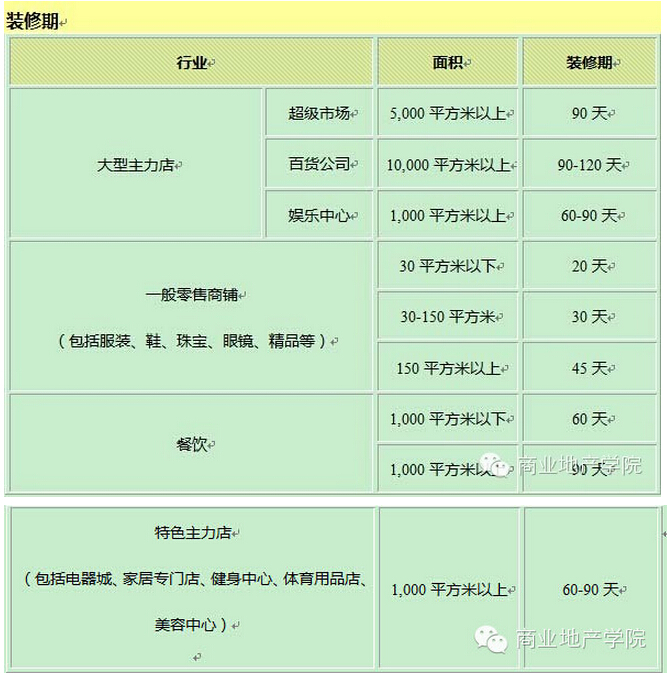 由于各行業(yè)的經(jīng)營手法及投入資金不同,租約期及裝修期亦有很大的差別,具體內(nèi)容見下表:
