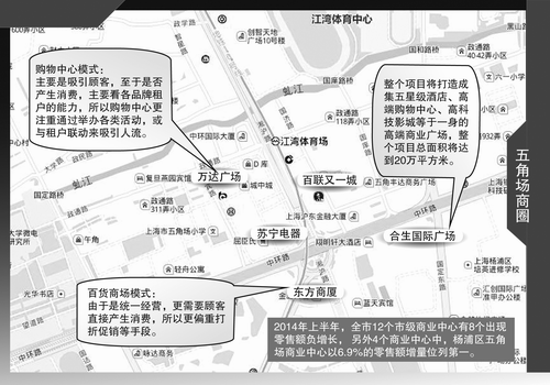2014年上半年,全市12個市級商業(yè)中心有8個出現(xiàn)零售額負(fù)增長,另外4個商業(yè)中心中,楊浦區(qū)五角場商業(yè)中心以6.9%的零售額增量位列第一。通過調(diào)整業(yè)態(tài),創(chuàng)新定位,五角場商圈在零售實體店營業(yè)額普遍下行的情況下讓人眼前一亮,今年以前,五角場商圈的營業(yè)額已經(jīng)連續(xù)7年保持兩位數(shù)增長,由此可見商業(yè)零售競爭激烈化、網(wǎng)上零售沖擊給五角場商圈帶來的影響依然不可小覷,五角場商圈進(jìn)一步升級優(yōu)化也還在繼續(xù)進(jìn)行。