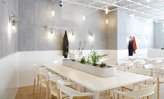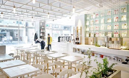 走入室內(nèi),清新的風(fēng)格是這家店給人的第一印象。日本人獨愛滿鋪留白中的一抹綠或一抹紅,這是他們對美的理解,也是他們對美的認(rèn)知。這家店延續(xù)了整個民族的審美情懷,大量的白色、淡乳色讓人從視野上就可以直接地感受到舒適,且不談明亮的白色可以提高室內(nèi)的亮度,單是人們在白紙一般的空間里,偶爾瞥到一角綠意或是一件原木色家具,都能清新到沁人心脾。內(nèi)墻的墻基與室外的立面墻一樣,從地面開始,在向上1米的高度上都貼了白色的瓷磚,創(chuàng)建出連續(xù)的線條,讓整個空間的內(nèi)外環(huán)境保持統(tǒng)一。