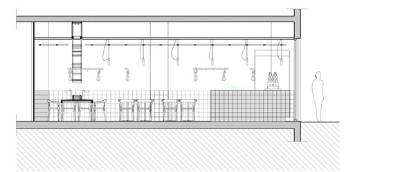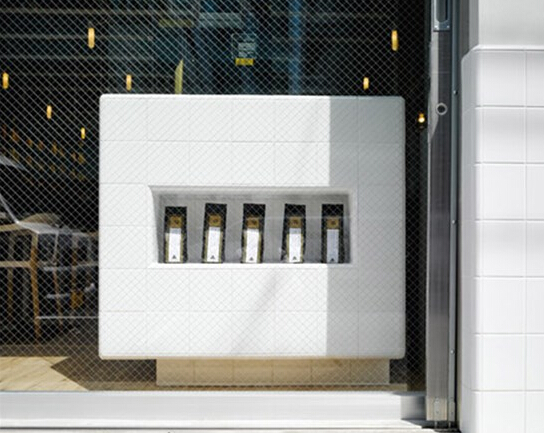 室內(nèi)靠近街邊的區(qū)塊鋪就了瓷磚、安裝了玻璃窗,會讓人誤以為這里要舉辦燒烤活動,旁邊還用高腳蹬和小型日本綠植加以點綴。在吧臺的背后,一面半透明的釉面內(nèi)墻將廚房隱藏起來,玻璃貨架上整齊地陳列著販?zhǔn)鄣纳唐。吧臺和收銀臺由兩個平鋪的版塊組成,看上去就像是化學(xué)版一樣。在另一側(cè),坐席區(qū)分布在較為空洞的天花板下:噴有白色涂料的框架延續(xù)了格子式實驗區(qū)的感覺。