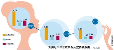 2013年,廣東丸美實(shí)現(xiàn)營業(yè)收入9.74億元,其中丸美品牌銷售額為8.17億元,占比83.88%;春紀(jì)品牌銷售額為1.57億元。2013年?duì)I收較上一年增長19.5%,不過相比2012年33%的增速,2013年主營業(yè)務(wù)收入增速明顯放緩。