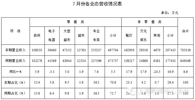 面對今年夏季高溫少、時(shí)間短的情況,各商家緊緊抓住暑期這個商機(jī),紛紛推出了夏令促銷活動,營收依然保持了平穩(wěn)增長態(tài)勢。經(jīng)我會和市商業(yè)信息中心對100家企業(yè)的《購物中心企業(yè)經(jīng)營情況》報(bào)表匯總,7月份營業(yè)總規(guī)模為70.51億元,按去年同期同口徑64.92億元,同比增長8.6%;剔除新增9家企業(yè)因素,同比增長2.0%;按上期同口徑73.37億元,環(huán)比減少3.9%。1~7月營業(yè)總收入同比增長8.6%。