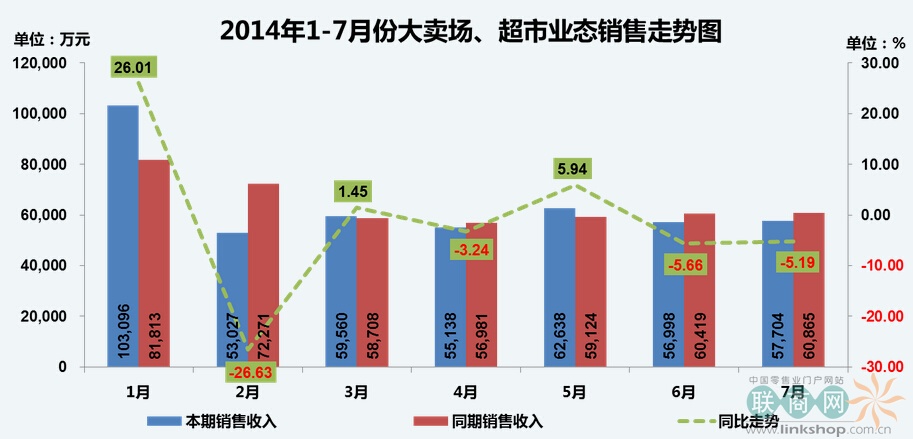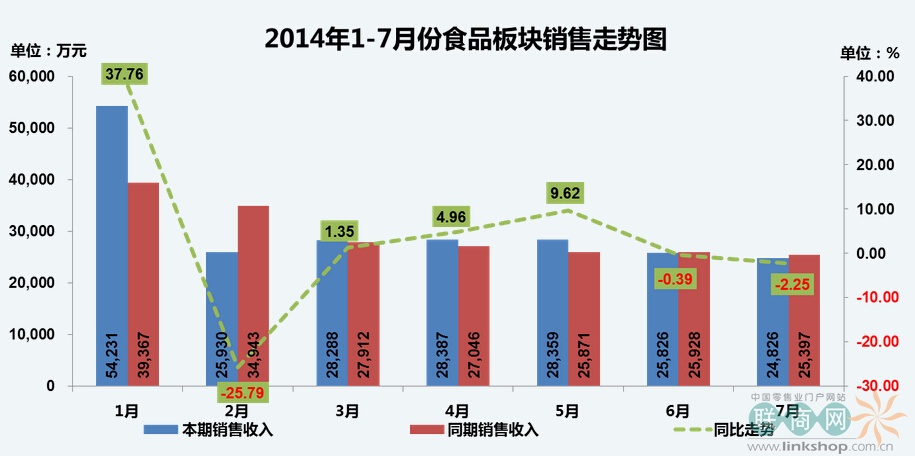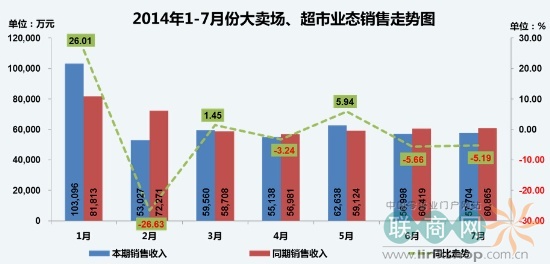 聯(lián)商網消息:上海市浦東新區(qū)商業(yè)信息中心對9個品牌的大賣場、超市樣本企業(yè)(共計29個樣本監(jiān)測點)監(jiān)測數據顯示,經營方面:7月份實現(xiàn)銷售收入5.77億元、同比下降5.19%、環(huán)比增長1.24%。多數企業(yè)預測由于受到網絡購物、今年夏季雨水較多和取消家電補貼等政策的持續(xù)影響,下半年經營狀況以持平為主。各板塊方面:食品板塊同比下降2.25%、生鮮板塊同比下降1.33%、非食板塊業(yè)績大幅下滑超10%。具體情況如下: