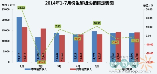 從氣象部門獲悉,7月份共有雨水天氣19天,且3個周末為雨天。這在一定程度上對生鮮產品的生產、運輸、儲存的工作帶來難度,同時也使得客流量有所下滑。從業(yè)態(tài)例會獲悉,由于高溫天氣明顯少于6月份,肉類商品銷售出現(xiàn)起色。據統(tǒng)計,7月份生鮮板塊銷售收入1.39億元、同比下降1.33%、環(huán)比增長0.45%。