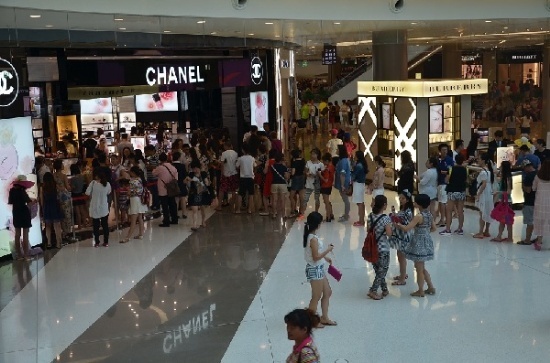 排隊(duì)等候進(jìn)入香奈兒化妝品專區(qū)選購(gòu)的顧客
