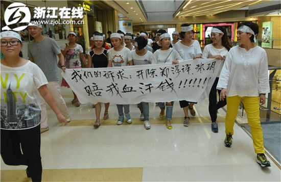 當天上午10點30分左右,在位于杭州錢江新城的萬象城購物中心5樓,一群商家代表頭綁寫著“我要吃飯”的白色布條,拉著橫幅,高喊“萬象城合約騙人”、“還我血汗錢”等口號,一路搭乘自動扶梯抵達商場一樓中央大廳。