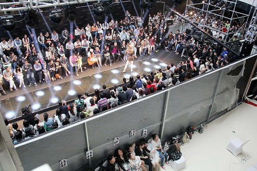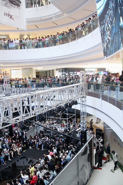在活動現(xiàn)場,一樓的時裝秀T臺已有上百名觀眾,商場的二樓、三樓和四樓也都擠許多市民。其中,圍觀市民以男士為主,熱鬧非凡。