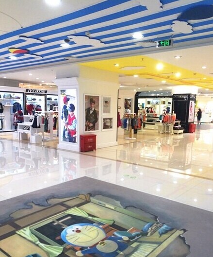 而五四路王府井百貨3F兒童區(qū)從兒童的思維、視覺(jué)角度出發(fā),抓住色彩豐富的這個(gè)特點(diǎn),結(jié)合夢(mèng)幻卡通的主題要素,通過(guò)色彩豐富的天頂、3D卡通地貼、卡通防滑地墊以及卡通造型拱門(mén)打造以DreamLand為主題的微型兒童專屬天地。