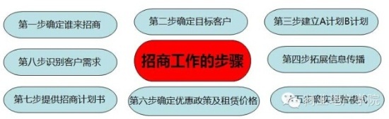填寫招商意向表-客戶資格考察-確定招商對(duì)象-繳納選鋪誠(chéng)意金-簽訂合同-提供裝修方案(客戶)-簽訂裝修協(xié)議,裝修入場(chǎng)證(客戶)-裝修鋪貨-正式營(yíng)業(yè)。