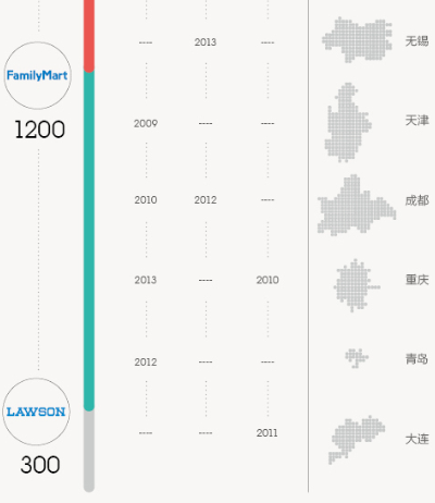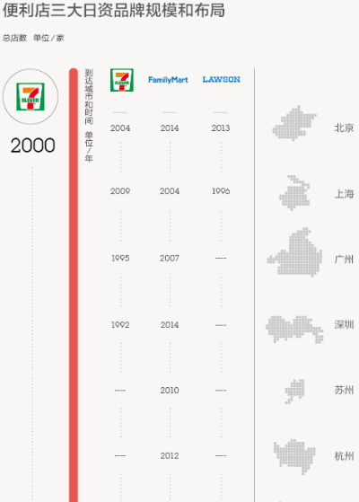 7-Eleven為加快擴(kuò)張,開始鼓勵(lì)合作伙伴“攜店”加盟。作為加盟的一種方式,“攜店”加盟意味著投資者可用原有的店面重新裝修,加盟費(fèi)相應(yīng)減少。而為了更快拿到進(jìn)入各城市的審批,羅森在日本和中國(guó)內(nèi)地的各地區(qū)公司之間增設(shè)了中國(guó)羅森投資公司,2013年還從上海華聯(lián)羅森的中方合作伙伴手中奪回控制權(quán),以期改變其在中國(guó)市場(chǎng)的落后地位。對(duì)全家來說,新戰(zhàn)場(chǎng)絕不止北京。