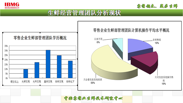 調(diào)查結(jié)果顯示,中國本土零售生鮮管理團(tuán)隊(duì)學(xué)歷,以及對信息、計(jì)算機(jī)系統(tǒng)操作水平普遍較低,導(dǎo)致目前零售企業(yè)對現(xiàn)代化、信息化技術(shù)應(yīng)用程度不高。另一方面整體年齡結(jié)構(gòu)偏大的生鮮管理工作者們,他們都有很豐富的商品知識(shí),但對于企業(yè)實(shí)現(xiàn)后臺(tái)數(shù)據(jù)一品一碼管理、平均售價(jià)、平均成本核算、表單化管理等一系列現(xiàn)代零售企業(yè)管理技術(shù)的普及有很大困難。