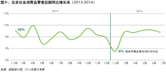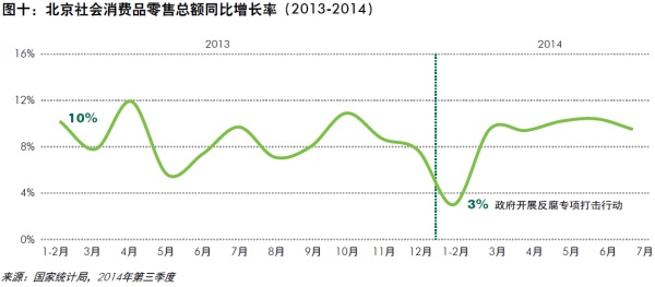 在2014年初,北京政府開(kāi)展“反腐倡廉、節(jié)約過(guò)年”的專項(xiàng)行動(dòng),大大影響了高端餐飲及奢侈品業(yè)績(jī),北京1-2月的社會(huì)消費(fèi)品零售總額同比增長(zhǎng)速度從2013年的兩位數(shù)跌到2014年的3%,其中衣著類商品同比更是下跌了3.3%。