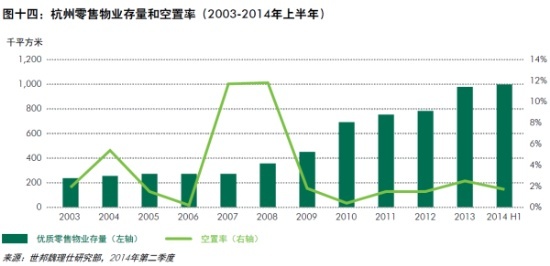 你可能不相信,杭州優(yōu)質(zhì)零售物業(yè)的空置率比上海還低。截至2014年二季度,杭州優(yōu)質(zhì)零售物業(yè)存量約為100萬(wàn)平方米,空置率只有1.7%。
