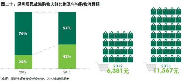 沒(méi)辦法和香港離得太近,所以深圳人民買(mǎi)大件直接去香港買(mǎi)了。根據(jù)赴港購(gòu)物的統(tǒng)計(jì),2012年9月至2013年9月,赴港購(gòu)物的深圳市民的比例高達(dá)43.0%,同比上升18.7%。與此同時(shí),深圳市民赴港購(gòu)物的人均消費(fèi)金額為11567元人民幣,與2012年6381元相比幾乎翻了一番。