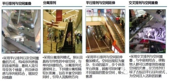 垂直人流動(dòng)線:室內(nèi)垂直交通系統(tǒng)對(duì)購物中心內(nèi)部人流的引導(dǎo)起到關(guān)鍵的作用,將直接對(duì)購物中心的經(jīng)營(yíng)產(chǎn)生影響。垂直動(dòng)線交通工具主要分為自動(dòng)扶梯、自動(dòng)步道、電梯、樓梯4個(gè)形式。