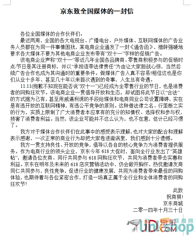10月30日下午,京東發(fā)布《致全國媒體合作伙伴的一封信》公開信,指出:11.11已經(jīng)成為全零售行業(yè)的節(jié)日,也是消費者的網(wǎng)購狂歡節(jié)。某電商(注:即阿里巴巴)試圖將節(jié)日合法方式據(jù)為己有的行為有違互聯(lián)網(wǎng)開放精神,有違公平競爭原則。